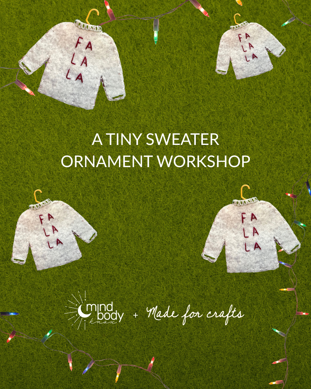 Join us for a cozy creative session where you’ll make your very own embroidered felt sweater ornament! You will learn basic embroidery stitches and customize your tiny sweater to be classic, cozy, or even delightfully tacky. You’ll leave with new skills and a one-of-a-kind ornament ready to hang or gift!
